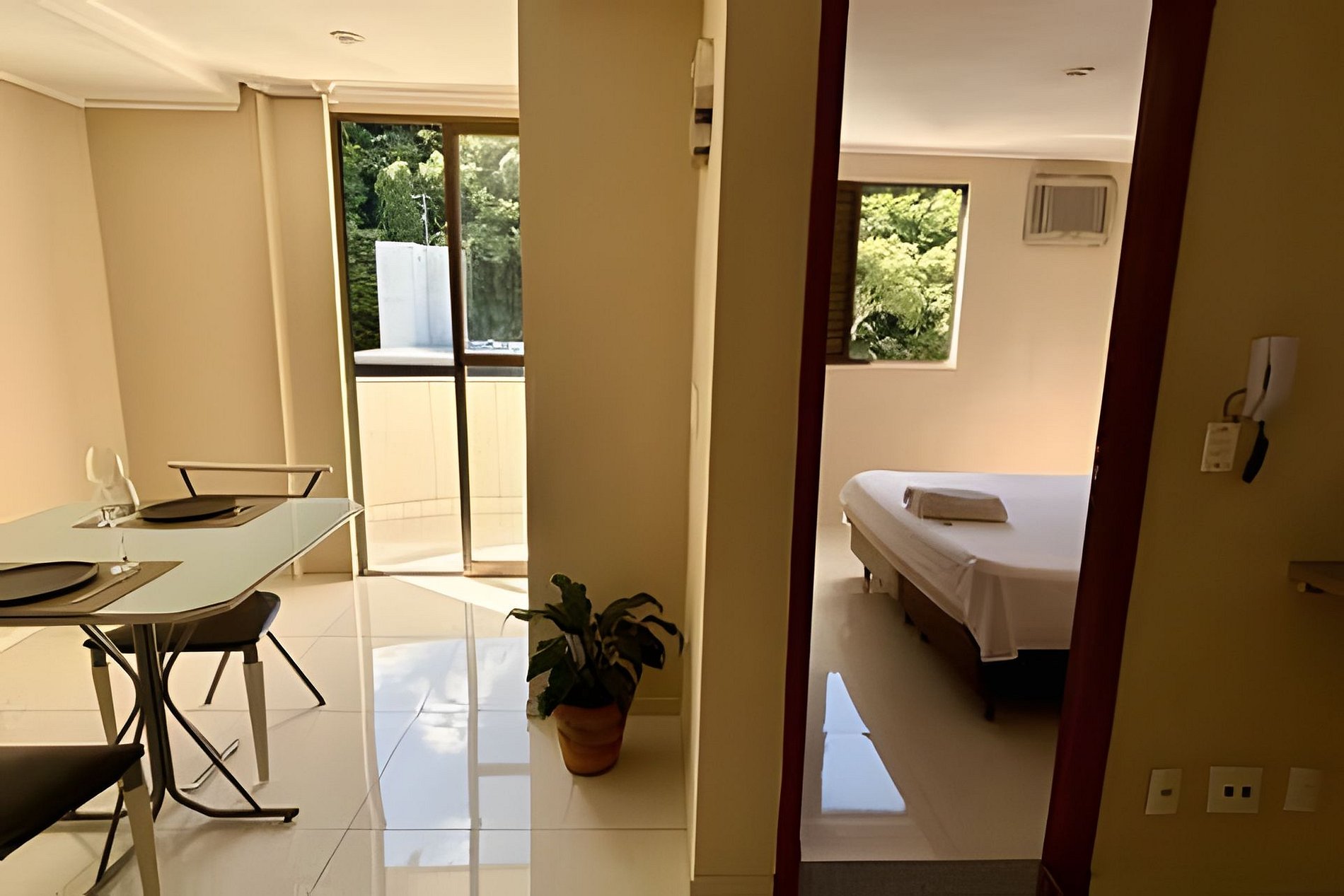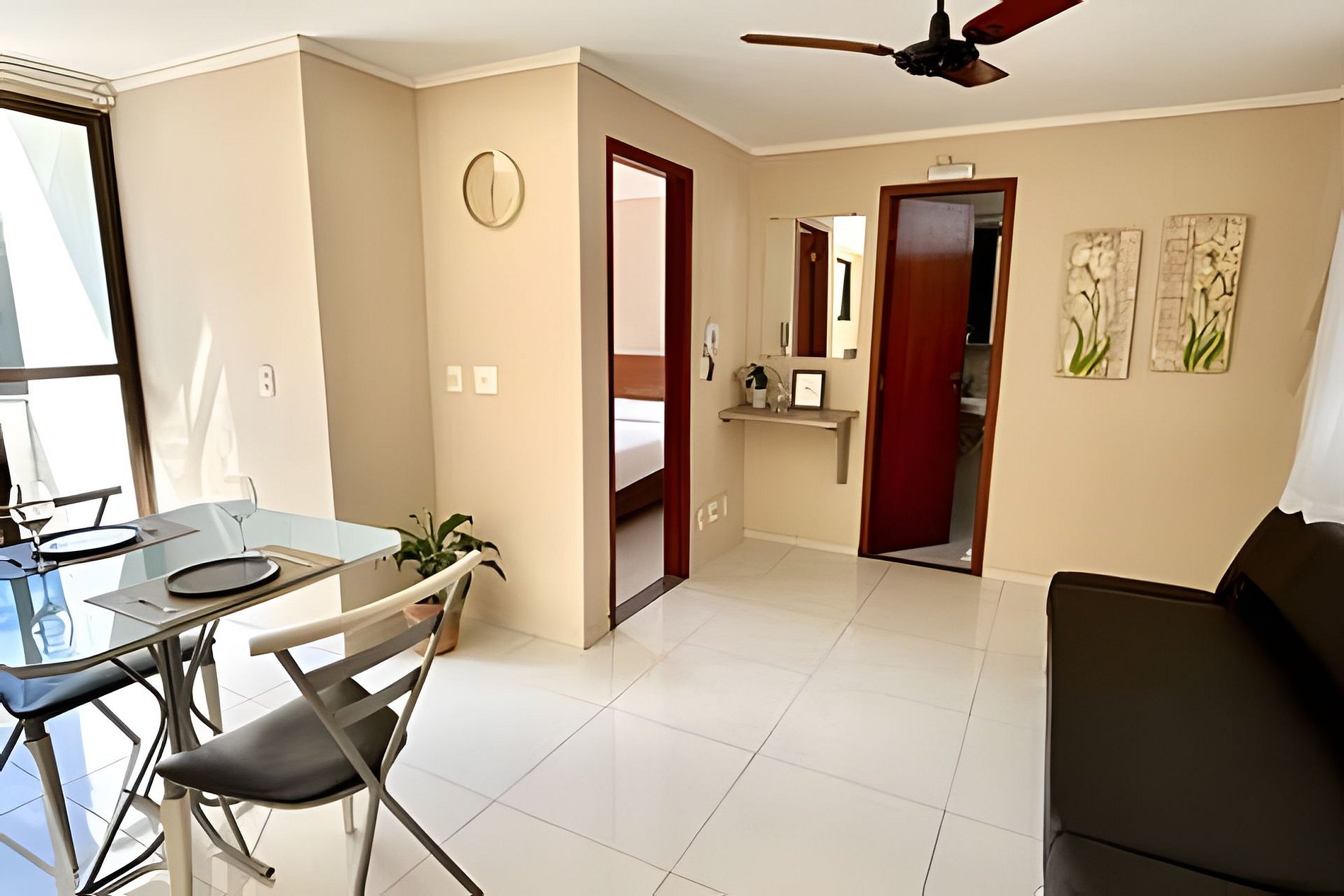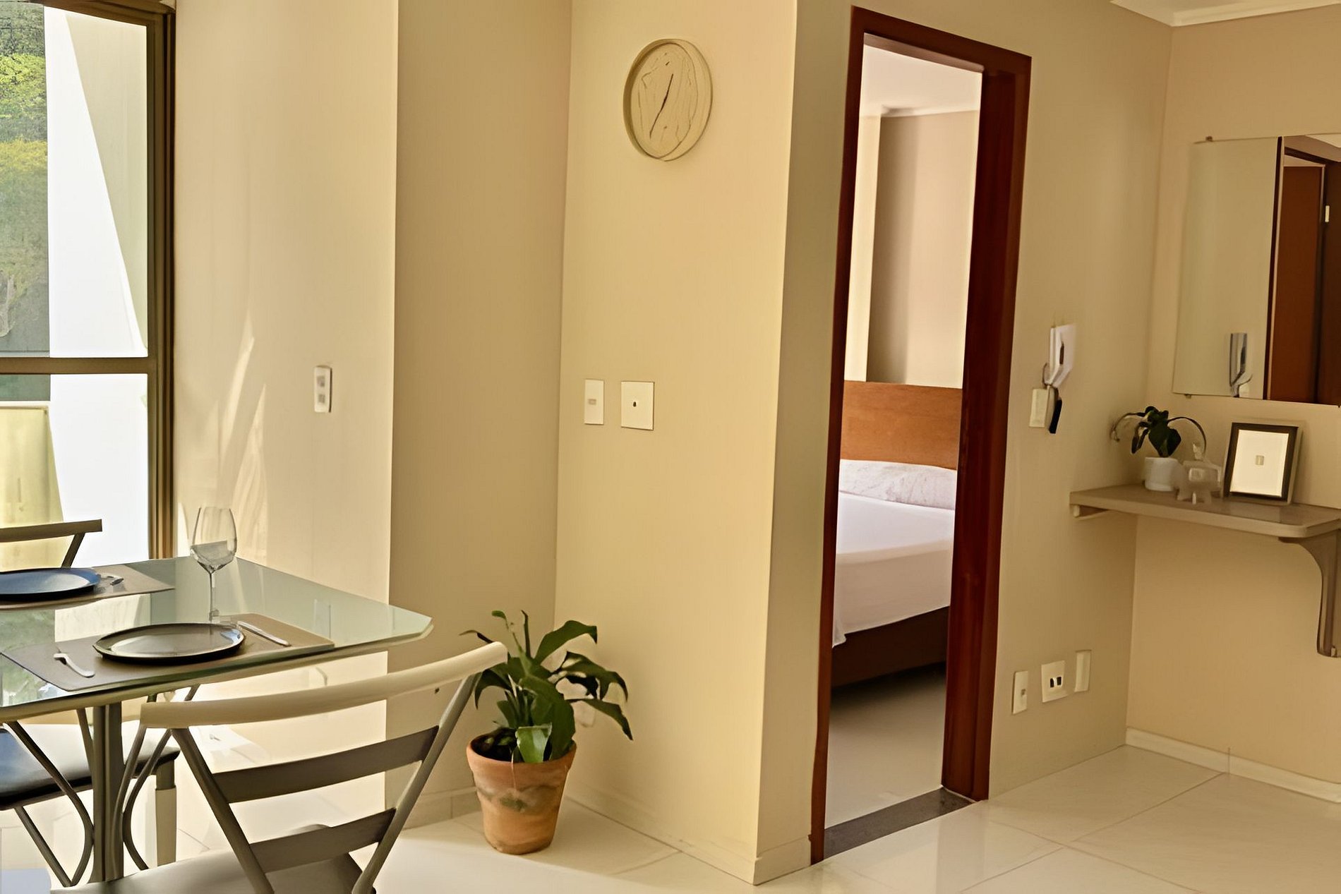 Hospede-se com Conforto e Praticidade! Apartamento moderno com recepção e dois elevadores. A sala possui sofá-cama retrátil e é integrada à cozinha equipada com frigobar, cooktop, e utensílios básicos. Varanda com vista para a rua. Quarto com cama de casal, TV a cabo, guarda-roupa e ar-condicionado. Banheiro com box e chuveiro elétrico. Uma vaga de garagem disponível no térreo com portão elétrico e acesso ao apartamento por elevador.