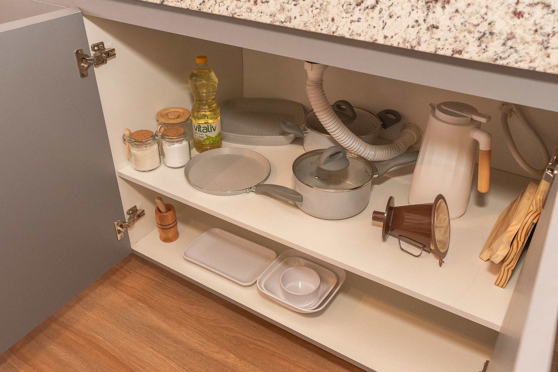 * Panelas, utensílios de cozinha, talheres, pratos, copos e xícaras;