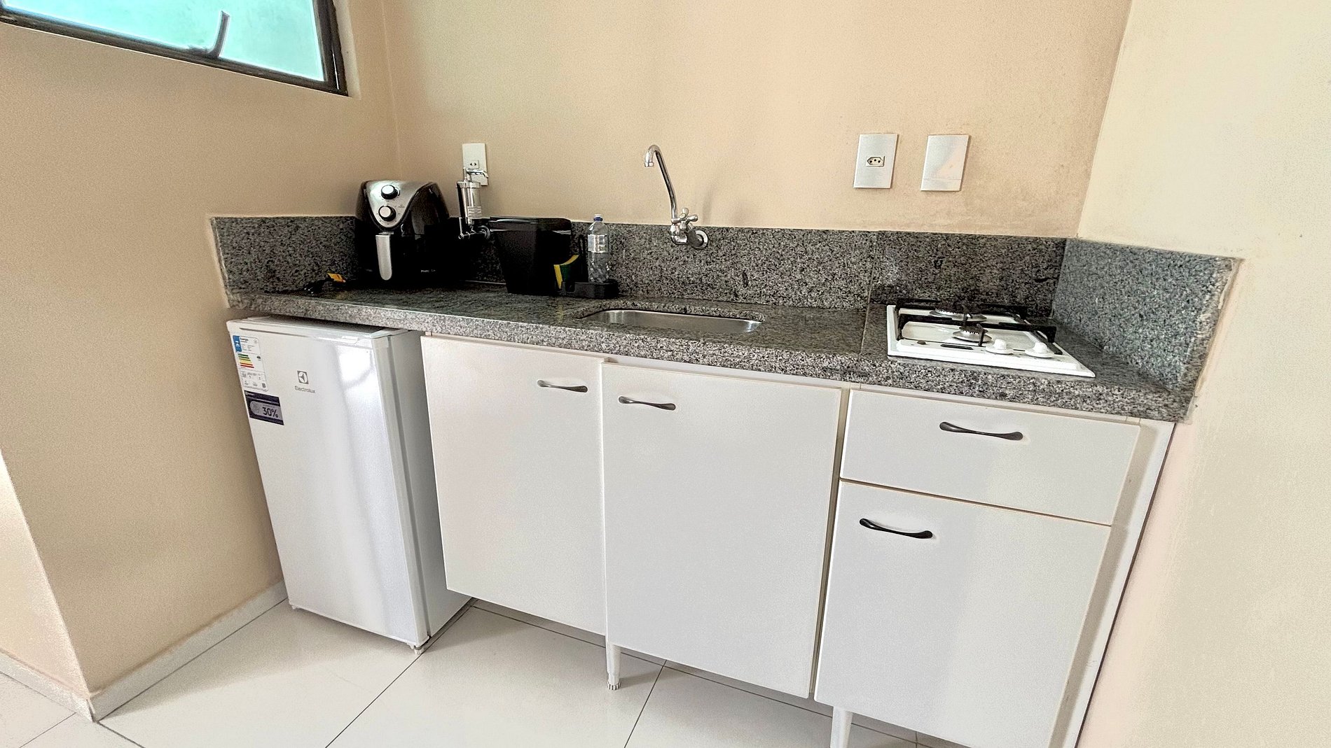 Conforto e praticidade para sua estadia. Apartamento de um quarto, sala conjugada com cozinha, varanda e banheiro, contendo: * Cama Queen bipartida com colchão de 33; * Travesseiros nasa tamanho medio 14 cm; *Sofa Cama de casal em courino; * Área externa; * Fogão cooktop 2 bocas a gás, * frigobar 90L; * Air Fryer e micro-ondas; * Panelas, utensílios de cozinha, talheres, pratos, copos e xícaras; * Chuveiro ducha 220 7500w de alta pressão; * Roupa de cama e banho completa; * lençol, fronhas, 150 fios 100 algodão manta de microfibra; * Toalhas de banho * Apartamento novo, moderno e funcional.